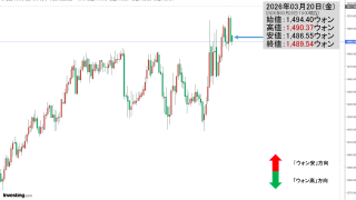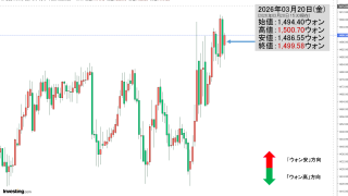2026年03月20日(金)の市場が開きました。10:00現在、ドルウォンのチャートは以下のようになっています(チャートは『Investing.com』より引用)。前日は長い陰線になりました。現在のところ「1ドル=1,489ウォン」近辺の攻...