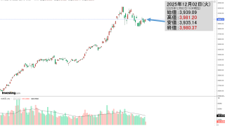 2025年12月02日(火)の韓国株式市場が締まりました。15:33現在、KOSPI(韓国総合株価指数)のチャートは以下のようになっています(チャートは『Investing.com』より引用)。陽線で終わりました。KOSPIは「3,994」...