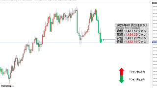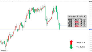 2026年01月28日(水)15:30現在、ドルウォンのチャートは以下のようになっています(チャートは『Investing.com』より引用)。陰線が伸びました。現在のところ「1ドル=1,421ウォン」近辺の攻防となっています。ローソク足1...