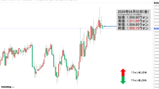 2026年04月03日(金)15:30現在、ドルウォンのチャートは以下のようになっています(チャートは『Investing.com』より引用)。陰線が伸びました。現在のところ「1ドル=1,505ウォン」近辺の攻防となっています。現在の天井は...