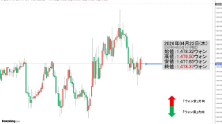 2026年04月23日(木)15:30現在、ドルウォンのチャートは以下のようになっています(チャートは『Investing.com』より引用)。「1ドル=1,480ウォン」が抵抗線になっています。現在のところ「1ドル=1,480ウォン」近辺...