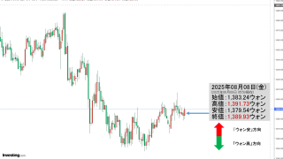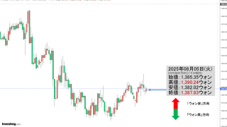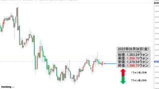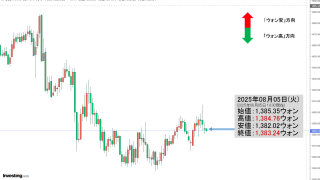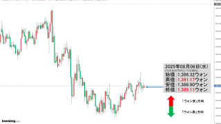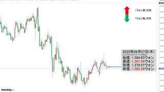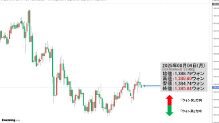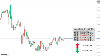 2025年08月11日(月)15:30現在、ドルウォンのチャートは以下のようになっています(チャートは『Investing.com』より引用)。底からは戻りましたが、まだ陰線です。現在のところ「1ドル=1,387ウォン」近辺の攻防となってい...