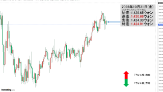 2025年10月31日(金)の市場が開きました。10:00現在、ドルウォンのチャートは以下のようになっています(チャートは『Investing.com』より引用)。これからローソク足の調整が入るかもしれませんが、現在のところ「1ドル=1,4...