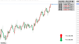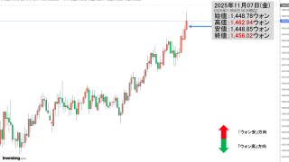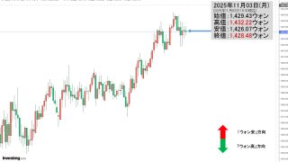 2025年11月03日(月)15:30現在、ドルウォンのチャートは以下のようになっています(チャートは『Investing.com』より引用)。残念ながらコマ足になりました。現在のところ「1ドル=1,428ウォン」近辺の攻防となっています。...