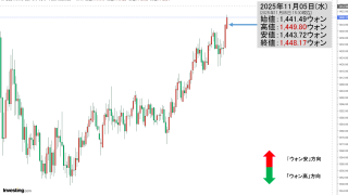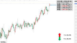 2025年11月04日(火)15:45現在、ドルウォンのチャートは以下のようになっています(チャートは『Investing.com』より引用)。陽線が伸びました。現在のところ「1ドル=1,438ウォン」で1,440のキリ番を巡る戦いとなって...