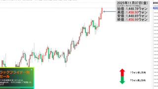 2025年11月03日(月)の市場が開きました。10:11現在、ドルウォンのチャートは以下のようになっています(チャートは『Investing.com』より引用)。現在のところ陽線です。「1ドル=1,431ウォン」近辺の攻防となっています。...